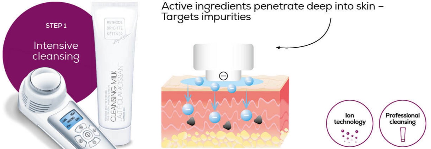 Bụi bẩn và các chất thải ở sâu dưới lớp da bề mặt có thể được đẩy và hút lên nhờ công nghệ ion. Máy giúp làm sạch da sâu từ bên trong, tăng cường dưỡng ẩm, tẩy tế bào chết, tái tạo và làm tăng độ đàn hồi của da.